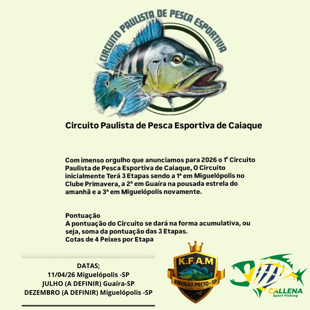 Vem aí o 4º Torneio de Pesca Esportiva de Caique. Serão validados peixes pegos em represas e rios não particulares dentro do estado de SÃO PAULO e rios que fazem divisa com o mesmo estado.